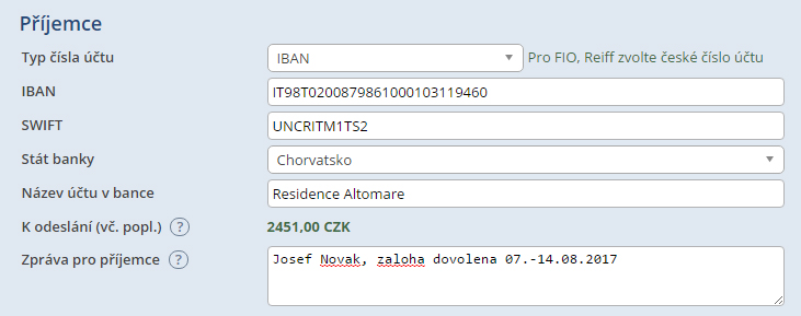 - Choose the format in which the recipient provided you with the bank account number. For international payments, it will almost always involve, i.e. IBAN (begins with two letters and a long series of numbers). If you want send euros to a Czech account, for example, at FIO and Raiffeisenbank, enter the standard national format as well as the euro account format.